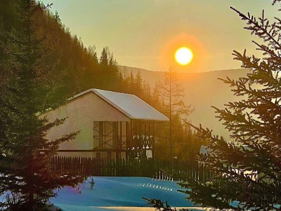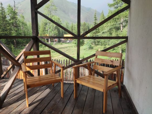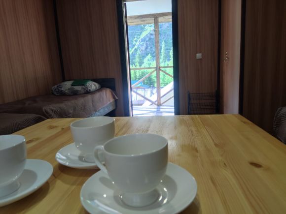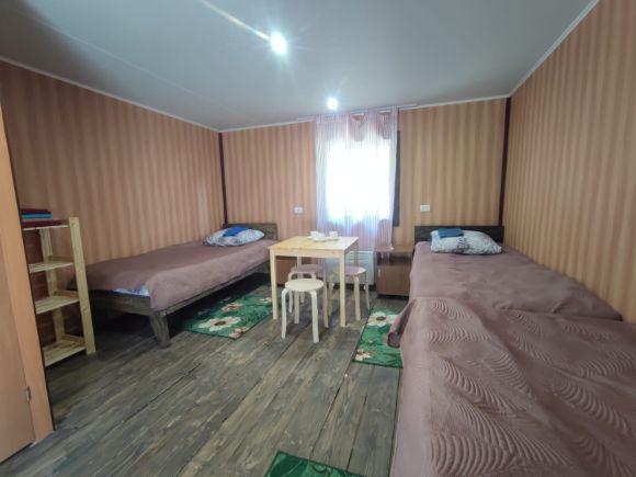 В номере есть: санузел, обогреватель, кофейных столик на троих, стеллаж для одежды.